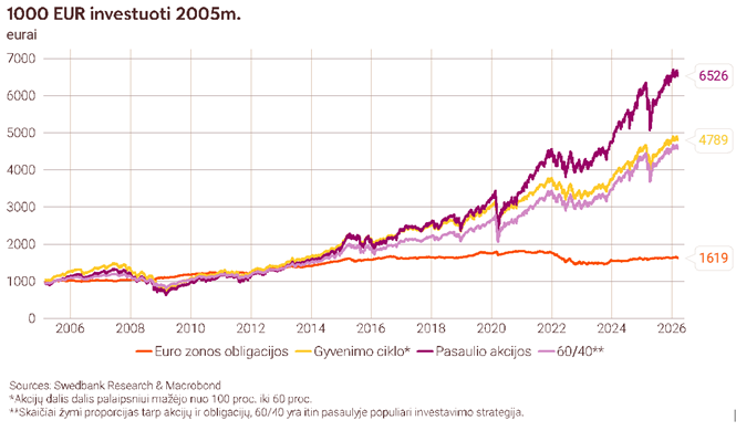 Per pastaruosius du dešimtmečius didžiausią grąžą generavo akcijos. 1000 eurų, 2005 m. investuotų į pasaulio akcijų indeksą sekantį fondą, šiandien būtų virtę 6592 eurais. Vidutinė metinė grąža siekė apie 7–8 proc., o pastarąjį dešimtmetį – net 11–12 procentų.